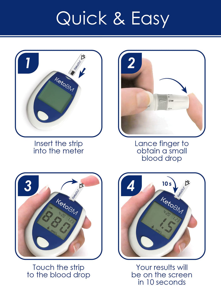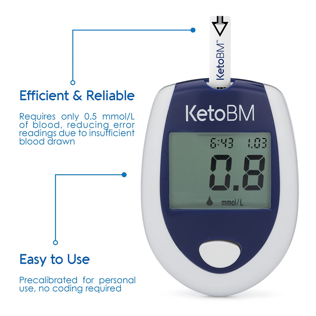 The KetoBM Ketone Blood Monitoring System is perfect for accurately tracking blood ketone levels on a ketogenic diet This complete kit includes everything needed for at home testing It comes with a meter, 10 ketone strips, lancing device and 10 lancets Made for home use and requires no calibration, code chips, or control solution while providing accurate and reliable results Exceeds all safety standards Buy now risk free with an unconditional 30 day money back guarantee and 2 year warranty