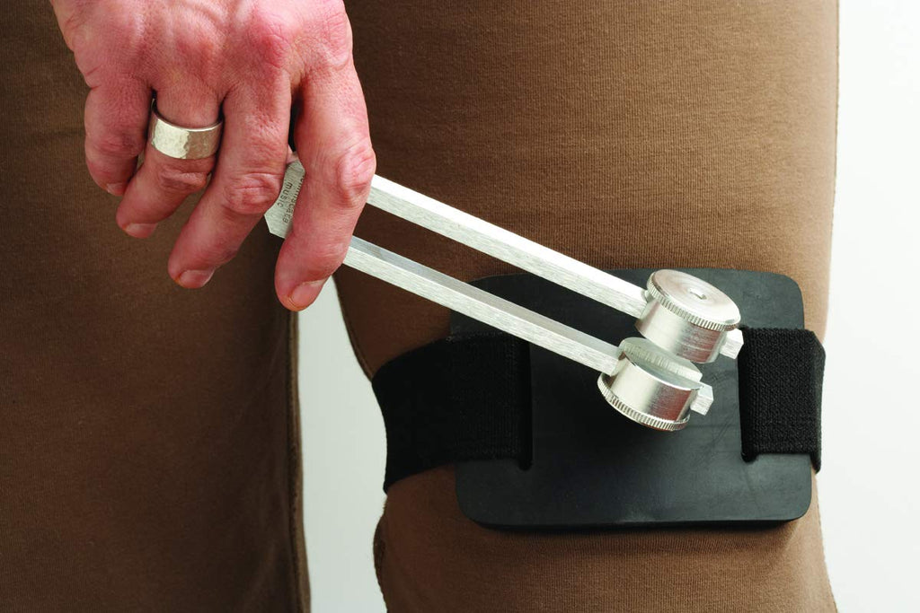 Now available in plus size, strapping is 28-30'' long.Practitioner Activator is designed to fit comfortably around the leg, leaving both hands free for tuning fork application. It comes with quality elastic strapping that wont loosen or slip, a contoured buckle that closes and releases easily, and a latex-free rectangular pad that is formed to fit comfortably on the leg.For professionals, this is an indispensable tool enabling the practitioner to move freely around a treatment table. Use to activate both weighted and un-weighted tuning forks.Note: Elasticized webbing contains latex.