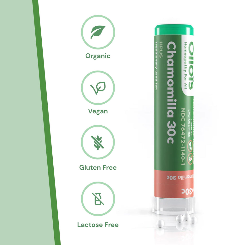OLLOIS Chamomilla 30C homeopathic single medicine. Traditionally used to temporarily improve symptoms of restlessness, gum irritation and irritability. The dosage is not related to the weight and age of the patient. In general, dissolve 5 pellets 3 times a day until symptoms are relieved or as directed by your health care professional. Contains Appx. 80 pellets in each tube, each dose should be placed under the tongue of adults and children, or in the cheek of an infant, where they will dissolve. It is preferable to take apart from meals. No known side effects, No Known drug interaction. For informational purposes only, Not intended for, and neither should it be taken as a substitute for professional medical advice. Stop use and ask a physician if symptoms persist for more than 3 days or worsen. If PREGNANT or breast-feeding, ask a health professional before use. Keep out of reach of children. These 'uses' Have not been evaluated by the Food and Drug Administration.