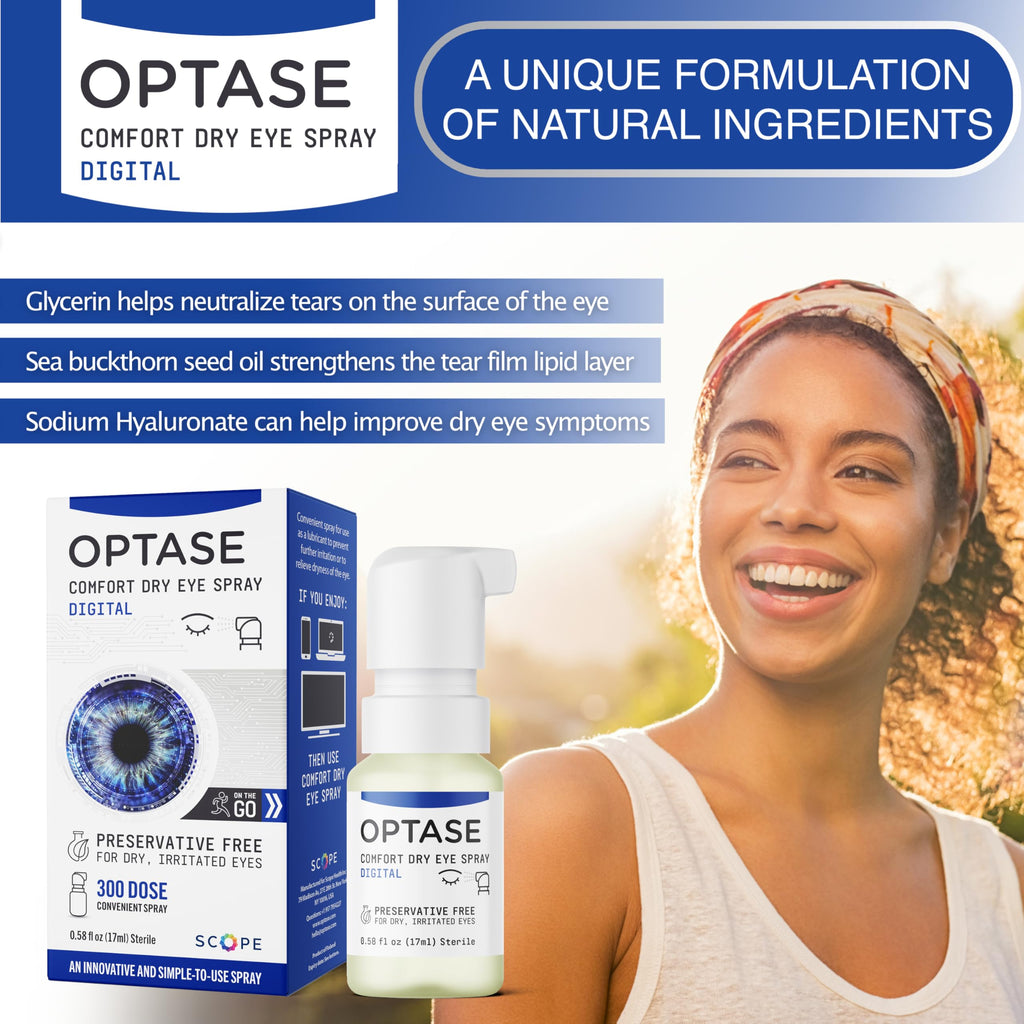 PRESERVATIVE FREE DRY EYE RELIEF Optase Comfort Dry Eye Spray provides preservative free dry eye relief in an innovative and simple to use bottle. Natural ingredients like glycerin and sea buckthorn seed oil combine with your eyes natural oils to hydrate, protect, and restore your tears, providing hydrating relief from eye pain, redness, and irritation. Optases preservative free formula works by restoring the lipid layer, protecting your tears from premature evaporation and excessive running. The lipids found in Optase Eye Spray combine naturally with those produced by the Meibomian glands at the lid margin. After application, this enhanced lipid mix spreads onto the tear film, stabilizing, moisturizing, and providing protection for the eye and eyelid. ALTERNATIVE TO EYE DROPS Optase Dry Eye Relief Spray provides the same soothing hydration of eye drops in an innovative, easy to use and convenient spray. The advanced bottle technology of Optase Eye Spray provides accurate and long lasting dry eye relief without preservatives. The two spray system allows for accurate application over the eyelid while maintaining sterility over 6 months, offering a perfect solution for dry eye sufferers who have trouble applying drops. DOCTOR RECOMMENDED DRY EYE TREATMENT For best results, use Optase Dry Eye Spray as part of the Optase expert recommended, preservative free eye care regimen for complete ocular health. Step 1: Heat - Optase Moist Heat Mask with HydroBead Technology releases a natural moist heat onto your eye lids to soften clogged oils in the eyelid glands Step 2: Cleanse - Optase TTO provide a gentle and preservative free Tea Tree Oil based lid wipe or gel to remove debris, bacteria, and oil for daily eyelid hygiene Step 3: Hydrate - Optase Dry Eye Spray and Intense Drops lubricate and hydrate to relieve dryness and irritation of the eyes and the eyelids