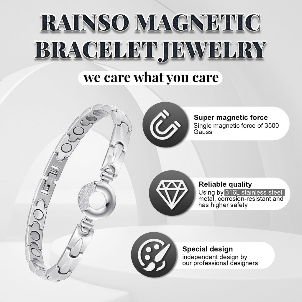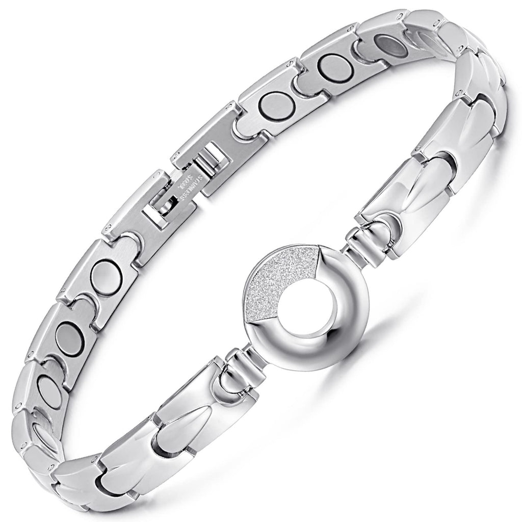 This titanium steel bracelet made by superior quality 316L stainless steel material,it with magnets elements,the magnetic element with magnetic caps and cover by professional glue. The Advantage of 316L stainless steel: 1. strong corrosion resistance 2. high plasticity 3. high-temperature The surface of bracelet adopt delicate polishing technology and plated with sliver,it's long colorfast than common electroplating. Precise casting technique, and polishing treatment by hands make our products to be excellent not only in model but also in quality. Also included a gift bag and easy-to-use Removal tool, allowing you effortlessly to adjust the bracelet to your requirements from the convenience of your own home. It must be the first selection of fashion and love! It is a nice gift for yourself, your parent or your friends.