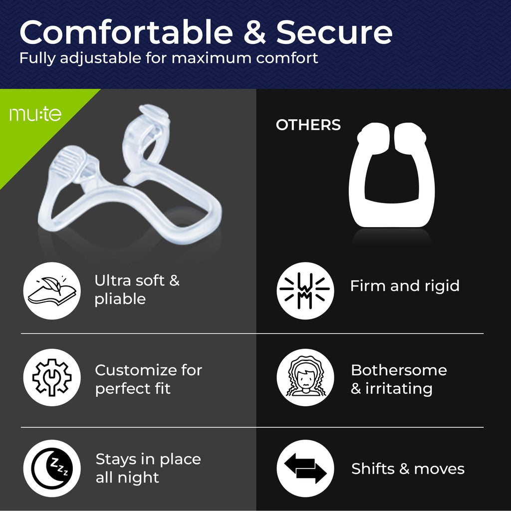 The Rhinomed Mute Nasal Dilator for Snoring Reduction is a soft, pliable polymer stent that dilates your nose. Mute increases the volume of air travelling through the nose during sleep, encouraging nasal breathing to alleviate congestion - factors critical to help stop snoring and for a better quality of sleep. Mute has been proven in clinical trials to increase air flow through nasal passages, on average, up to 38% over nasal strips. Made from ultra-soft medical grade bio-compatible polymers conforming to the strictest medical standards, Mute stays in place throughout the night. Mute comes in three different sizes, and each device has individually adjustable left and right stents to further refine the fit. We recommend first buying the assorted size pack, which includes one of each size, to help determine which size offers the best fit for you. Mute nasal dilator units can be reused approximately ten times. FDA registered.