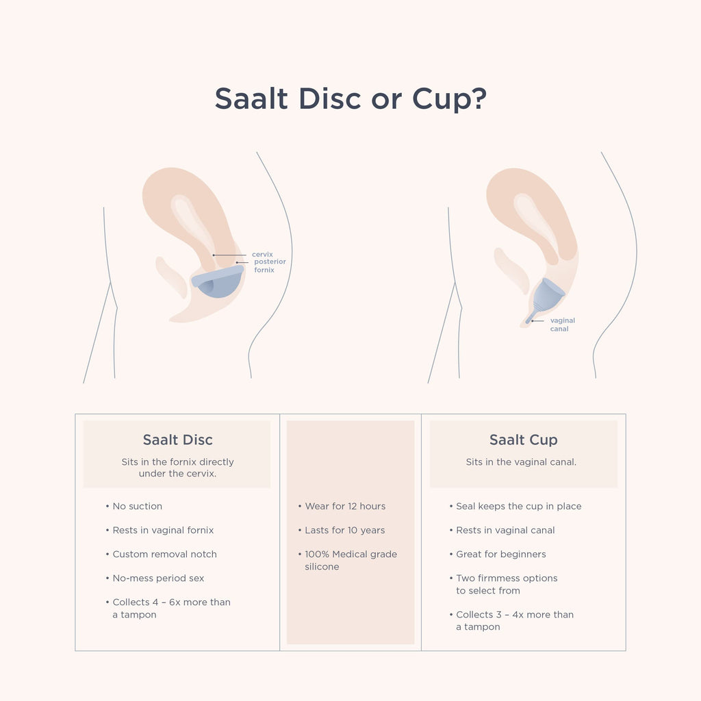 • Q: Can I use the Saalt Menstrual Disc with an IUD? A: Yes, the Saalt Menstrual Disc does not rely on suction to seal, which makes it a safe option for individuals with an IUD.