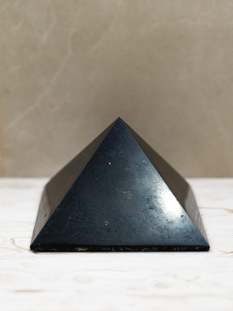 Shungite pyramid basis side length - 100 mm / 3,94 inch / 10 cm. Crystal pyramid made of polished III type regular shungite. Type III shungite contains up to 50% of carbon. It has deep gray or black color, small pyrite infusions are possible. | Polished shungite pyramid is a good solution for protection home and personal health. Healing crystal brings feelings of calmness, harmony, and a positive attitude towards life | Shungite is called The Stone of Life and is said to eliminate and absorb all that imposes a hazard on people and living beings, and to concentrate and restore all that is helpful for a human being | Put your shungite charging pyramid around the house - next to the TV, laptop computer, modem, wifi adapter, mobile or any devices; in your bedroom, kitchen or workspace; anywhere you feel need for balancing your energy from negative frequency and aura cleanse | Manufactured by Shungite Club