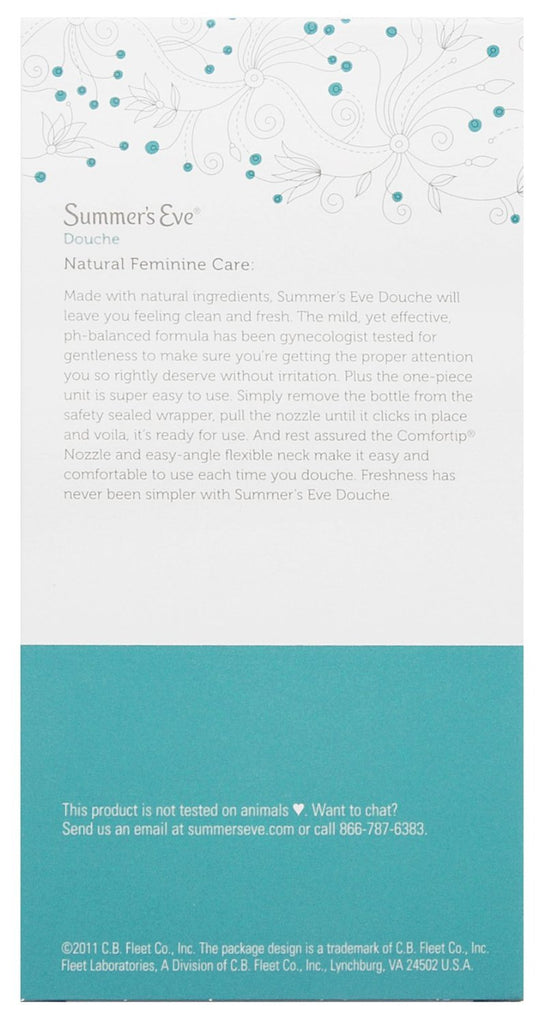 • Q: What ingredients are in Summer's Eve Douche? A: The specific ingredient list is available on the packaging. The formula is designed to be gentle and effective, but if you have any allergies or sensitivities, please review the label carefully.