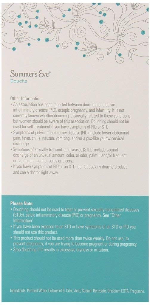 Summers Eve Fresh Scent Douche will leave you feeling clean and fresh. The mild, yet effective, pH-balanced formula has been gynecologist tested for gentleness to make sure youre getting the proper attention you so rightly deserve without irritation. Super easy to use, simply remove the bottle from the safety sealed wrapper, pull the nozzle until it clicks in place and voila, it's ready to use. And rest assured the Comfortip Nozzle and easy-angle flexible neck make it easy and comfortable to use each time you douche. 4.5 Fluid Ounces per bottle. 3 Bottles Total