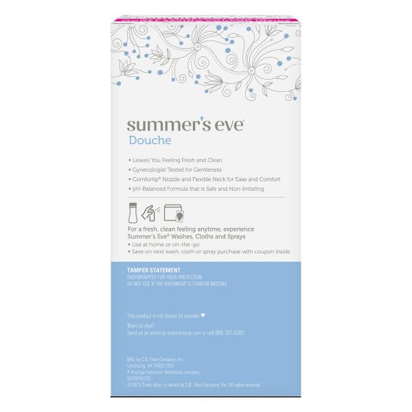 Summers Eve Feminine Douche will leave you feeling clean and fresh. The mild, yet effective, pH-balanced formula has been gynecologist-tested for gentleness to make sure youre getting the proper attention you so rightly deserve. To use, remove the bottle from the safety-sealed wrapper, pull the nozzle until it clicks in place and voila, it's ready. And rest assured the Comfortip Nozzle and easy-angle flexible neck make it easy and comfortable to use. All Summer's Eve products - along with every unique scent - are gynecologist-tested to ensure they are safe, even for sensitive skin. Summer's Eve Feminine Douches are available in a variety of scents and sizes. Be sure to check out Summer's Eve Feminine Cleansing Washes and Cleansing Cloths for all your feminine cleansing needs.