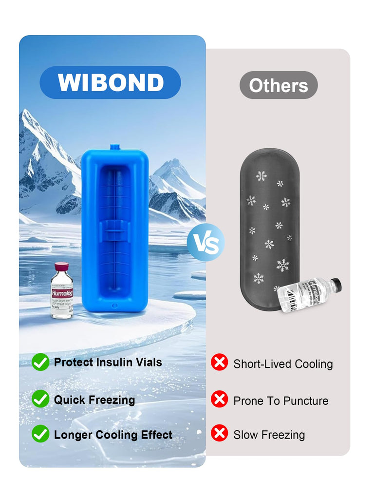 Keep Your Insulin Safe Anywhere, Anytime WIBOND Insulin Vials Cooler Case is engineered for diabetics who demand reliable temperature control and ultimate portability. TSA-approved for seamless travel. ?? Precision Cooling Technology: Our HDPE polymer ice brick maintains for 8-12 hours - critical for insulin efficacy. (Pre-freeze 8+ hours before use) ?? Travel-Smart Design: Product Application: Regular 10ml insulin vials Fits 1 insulin vials organizer, 1 reusable ice brick Waterproof 600D Oxford exterior + 4mm insulation Anti-slip handle + secure double zippers ??? Built for Real Life: Drop-resistant ice brick protects vials from impact Stain-resistant lining wipes clean in seconds Weighs under 1 lb - slips into backpacks/purses ?? Includes: 1x Cooler Case + 1x Reusable Ice Brick ?? NOTE: (1) The package does not contain insulin and other diabetes supplies. (2) If placing insulin pens on the mesh pocket, please use protective sleeves on the medicine bottles to avoid squeezing. ?? Diabetes Care Simplified: Travel confidently knowing your life-saving medication stays protected, organized, and ready when you need it.